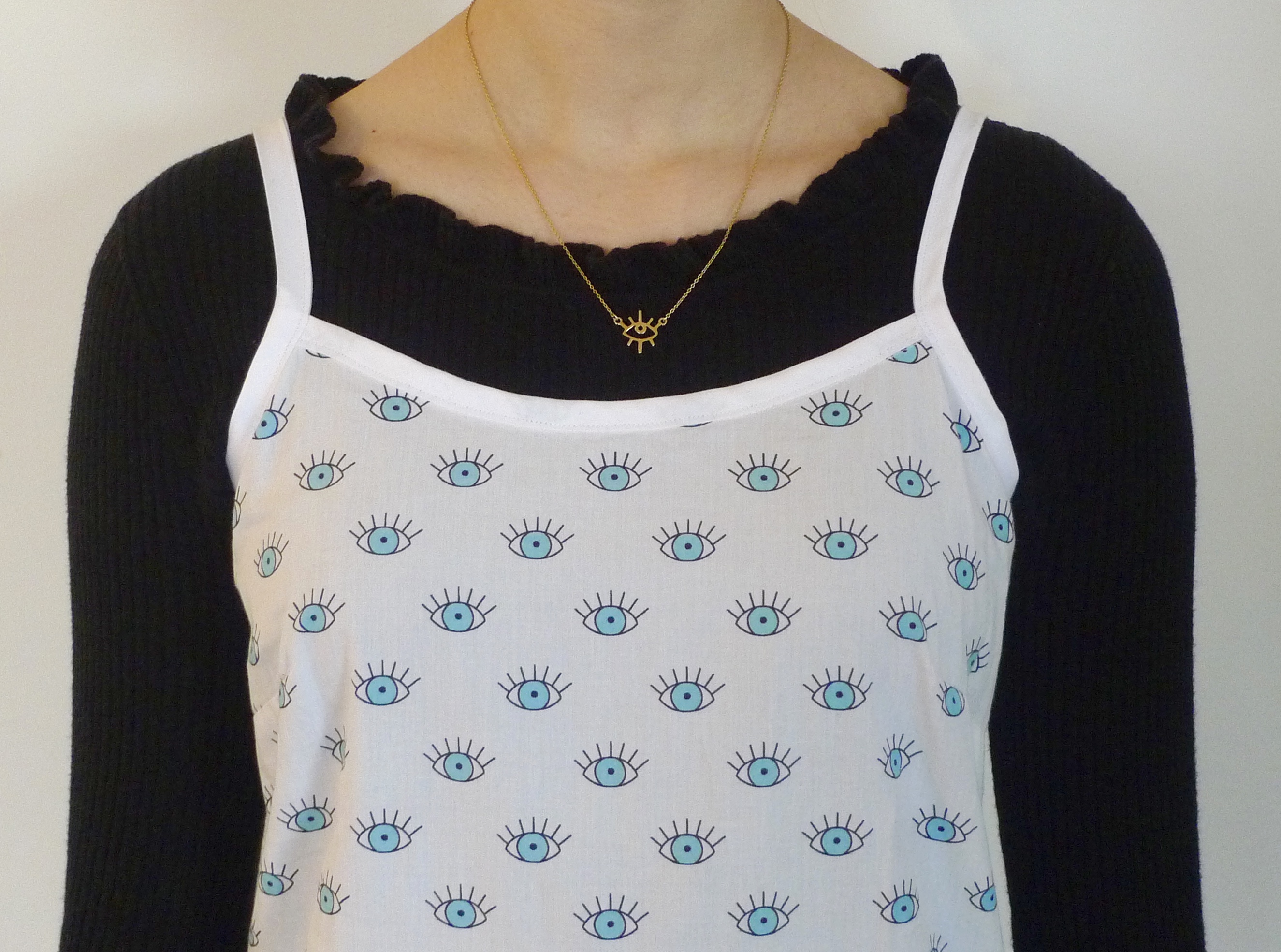 For the first dress (which I like to call my ‘VFD dress’) I used an eye print cotton lawn from Fabric Godmother. I instantly fell in love with this fabric, and purely by accident one of the closed eyes ended up in the middle of the dress, which I was very happy about! Although cotton lawn is very thin, I’ve still been wearing this dress a lot during the cold weather, with a jumper underneath. I deviated from the pattern a bit by using french seams, as the fabric is quite see-through and this makes it look neater.