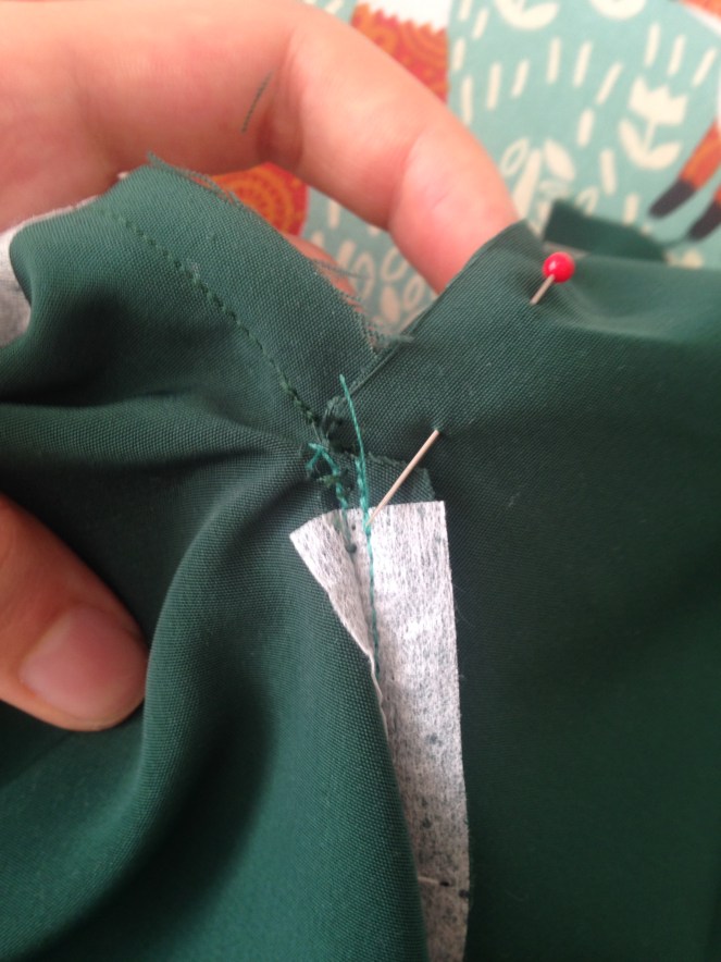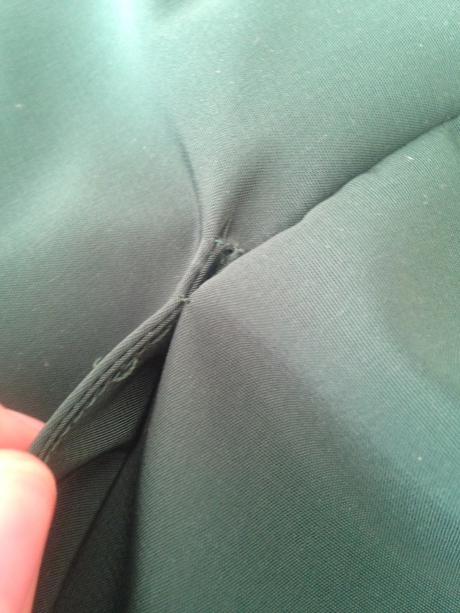 For the fabric, I chose this bottle green polyester peachskin from Fabric Godmother. I didn’t notice it was polyester (a fabric I usually shy away from as I’m incredibly static!) until I’d bought it, but so far it’s only been static once or twice. It’s hard to capture in photos, but this fabric has a sheen to it and catches the light beautifully. Plus, it doesn’t wrinkle- at all! Maybe it’s because I’m used to sewing with natural fibres, but this kind of blew my mind.