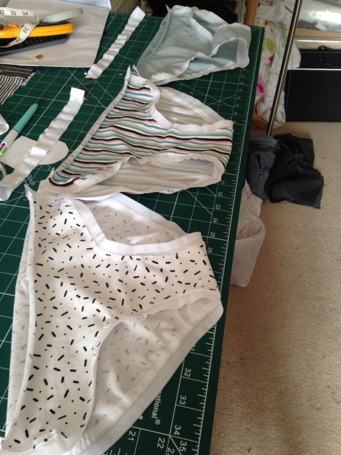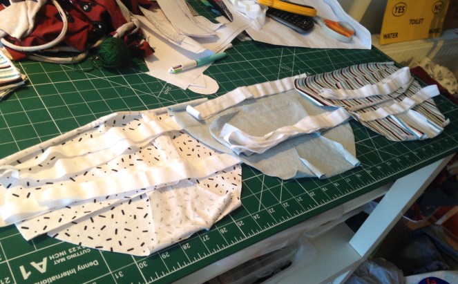 Batch sewing basically means you cut out several lots of whatever it is you’re making (which usually seems to be underwear) and follow each step of the pattern with all of them before moving onto the next step. This works especially well for items like pants, which can feel very labour intensive if you’re only sewing one pair. For example, when I made my Nixies I cut everything out and measured out the elastic lengths for each pair before I started sewing: