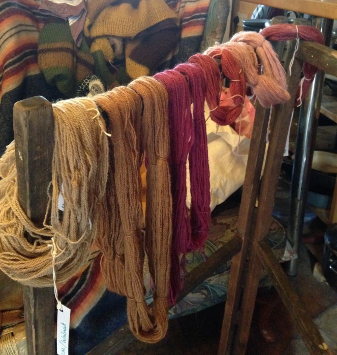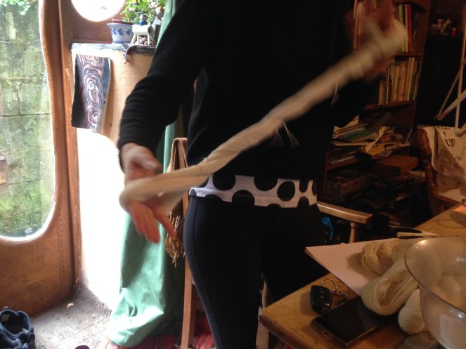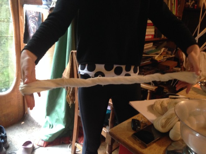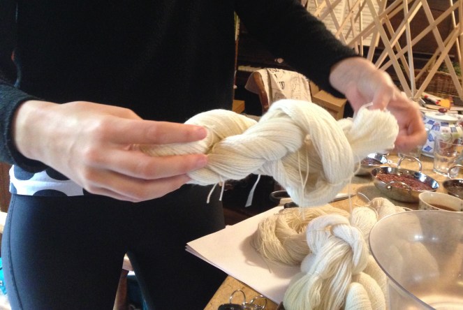 Then came the best bit: the drying. I learned how to ‘spin’ dry the freshly washed skeins, which basically entails holding one end of the skein and spinning it round and round until your arm gets tired! It’s an excellent way of releasing some of your inner rage, just make sure you stand well away from other people when you do it!