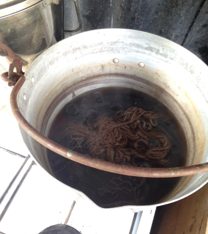 Next we used two different mordants, Alum and Chrome, each of which affected how the dye coloured the yarn differently (I’ll show photos at the end). The main difference in the preparation of the two is that Chrome is light sensitive, so you have to be careful when getting the yarn in and out! For a couple of the dyes (avocado and walnut) you don’t need to use mordant, so we kept some skeins unmordanted for those.
