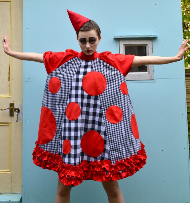 The dress has a lot of influences (strangely, In The Night Garden was one of them), but if I had to describe the aesthetic of the final garment I would say… ‘sad clown/ gingham fly agaric mushroom but make it fashion‘. So when I did the makeup for these photos, I tried to create a 1920s pierrot clown look to match the dress. I’m SO happy with the result, and how it sits on the edge of being really quite creepy, but also fashiony at the same time!